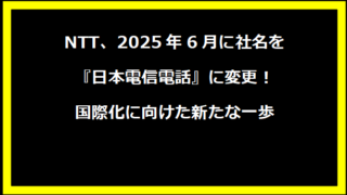 ◆トレンド◆◆ NTT、2025年6月に社名を『日本電信電話』に変更!国際化に向けた新たな一歩 NTT、2025年6月に社名を『日本電信電話』に変更!国際化に向けた新たな一歩NTTとは?日本電信電話株式会社は、日本の... 2024.12.28 ◆トレンド◆◆