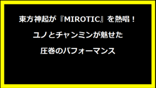 ◆トレンド◆◆ 東方神起が『MIROTIC』を熱唱!ユノとチャンミンが魅せた圧巻のパフォーマンス 東方神起が『MIROTIC』を熱唱!ユノとチャンミンが魅せた圧巻のパフォーマンス番組概要『発表!今年イチバン聴いた歌~年... 2024.12.28 ◆トレンド◆◆